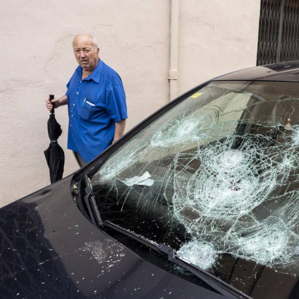 El inusual tamaño de la piedra caída por la granizada provocó que los cristales de numerosos vehículos quedaran destrozados y también han sufrido importantes daños tejados y ventanas de algunos inmuebles.