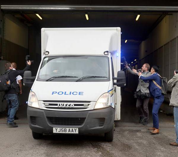 Vehículo policial que transporta a sospechoso de asesinato de diputada británica sale de un tribunal de Westminster, Londres. Foto: EFE