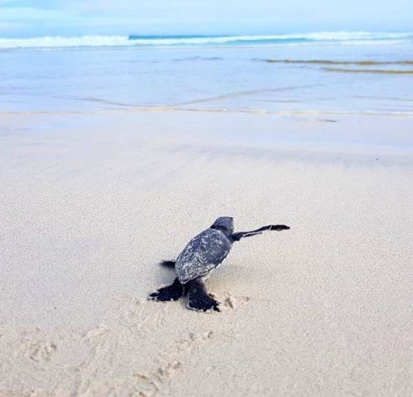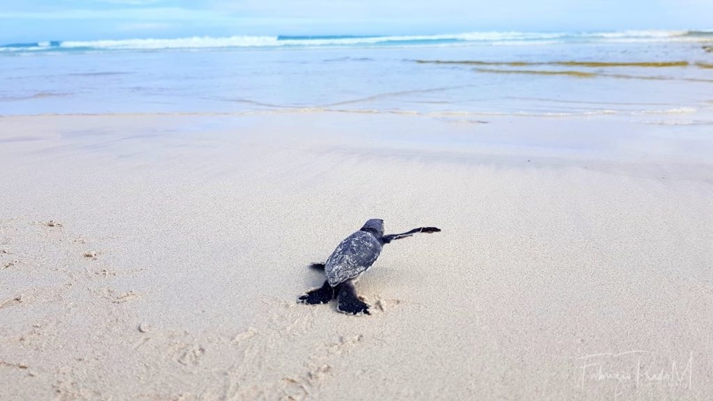 Tras la eclosión, las tortugas deben emprender una vertiginosa carrera hacia el mar, para evitar ser presa de los depredadores naturales que pueden ser aves u otros animales marinos, aunque también están bajo la amenaza de animales domésticos y el hombre.