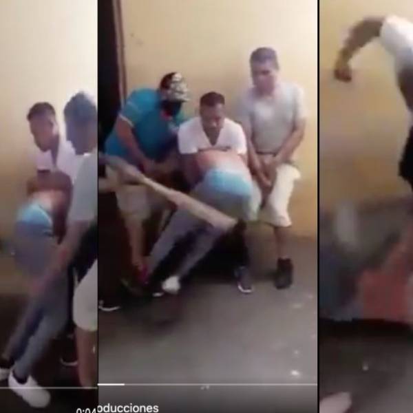 Al principio, en el video se observa a tres sujetos sometiendo a quien torturan, mientras que uno más le pega con una enorme tabla y otro más observa. Otro graba el clip, al parecer, con un celular.