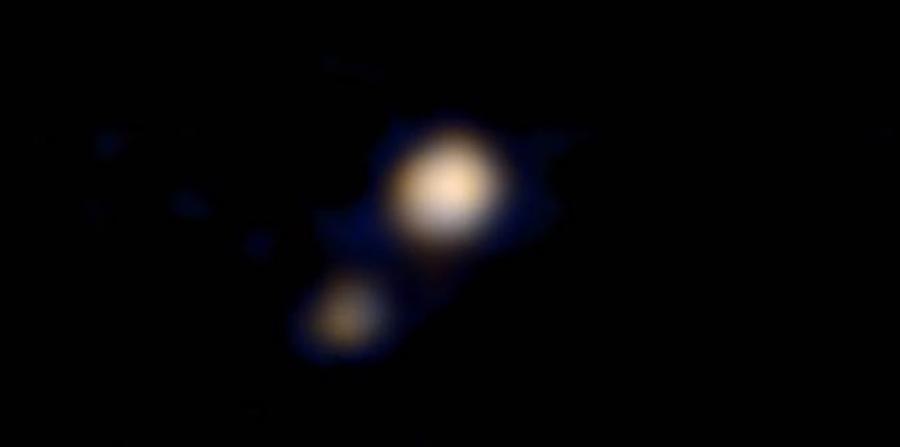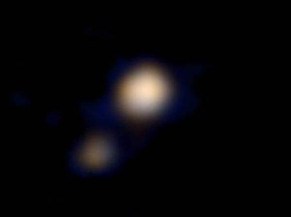 La Agencia Espacial Estadounidense (NASA) publicó hoy la primera imagen en color de Plutón y su luna más grande, Caronte, obtenida por la sonda "New Horizons", que debería llegar al planeta enano el 14 de julio de este año.