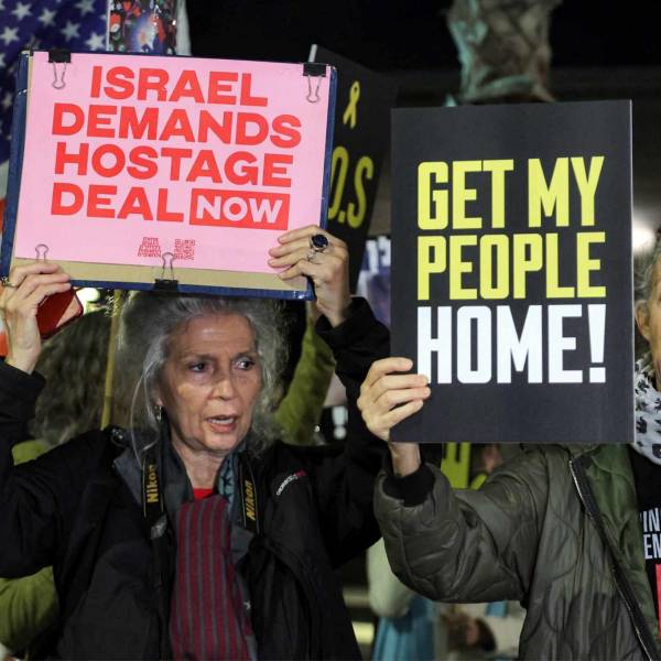 Familiares de israelíes mantenidos como rehenes en Gaza se reúnen en una manifestación para pedir a Estados Unidos que intervenga para su liberación.