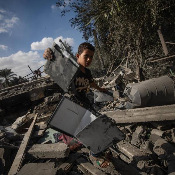 Un niño palestino inspecciona entre los escombros de un edificio destruido tras un ataque aéreo israelí( )