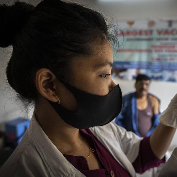 Una enfermera prepara una dosis de vacuna contra el covid-19 en un centro de vacunación privado en Gauhati, India.( )