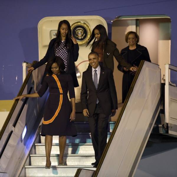 La aeronave que transportó a Obama, su esposa Michelle, sus hijas, Sasha y Malia, y su suegra, aterrizó en el aeropuerto internacional de Ezeiza a la 01h10. Al bajar del avión fueron recibidos por la canciller argentina Susana Malcorra.