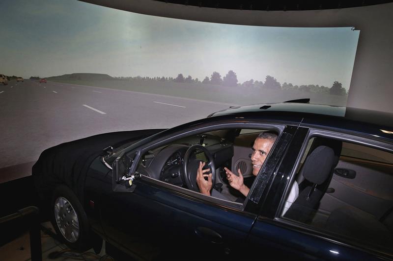 El presidente de EE.UU., Barack Obama, trató de promocionar la innovación en infraestructuras al ponerse por primera vez en seis años detrás de un volante, el de un simulador de conducción que, tras circular a gran velocidad por una autopista virtual, le dejó "un poco mareado".