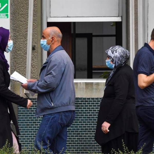 Gente camina con mascarillas frente a un hospital en Macedonia. Foto: EFE