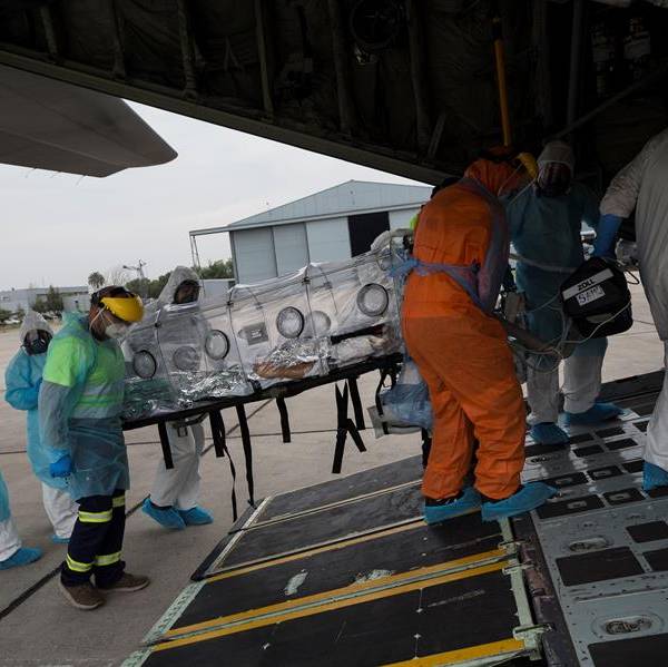 Personal sanitario sube a un avión a un paciente crítico en Chile. Foto: EFE