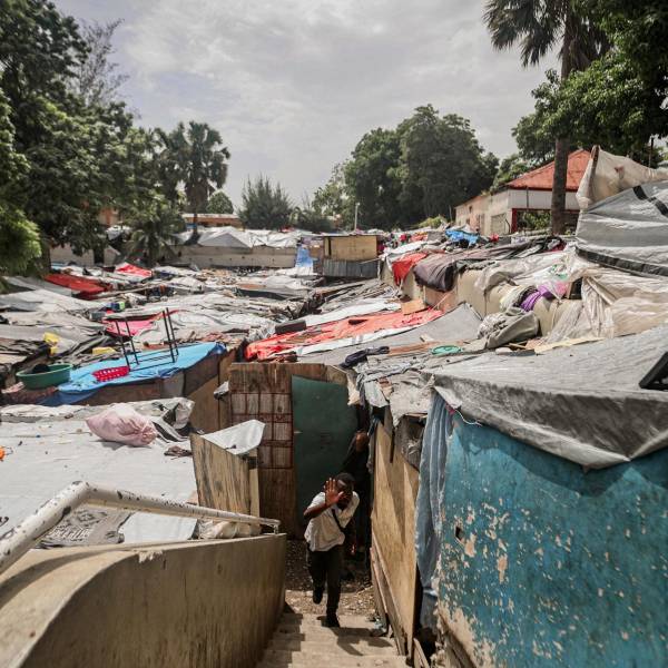 Un hombre camina en el campamento de refugiados Camp Mormón, donde cientos de familias han encontrando protección tras abandonar sus hogares por la violencia de las pandillas, en Puerto Príncipe, Haití( )