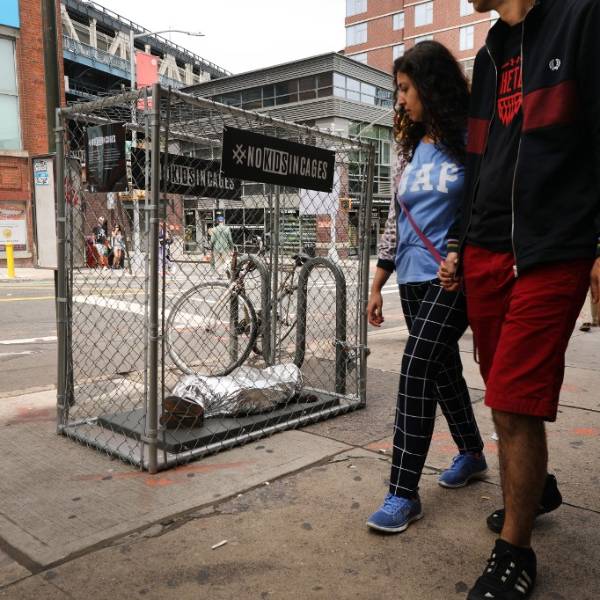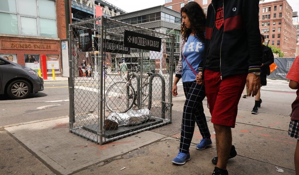 Instalación de arte en Nueva York contra supuestos malos tratos a niños migrantes. Foto: AFP