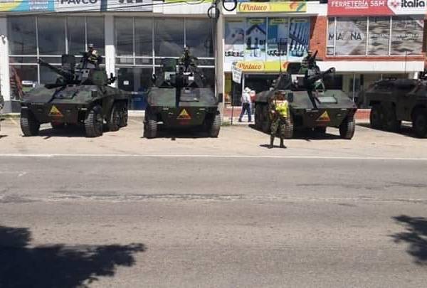 Imagen de tanquetas y militares un día antes de la protesta en Colombia. Foto: Twitter @AndrsTrece