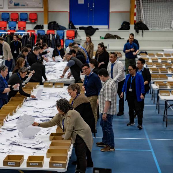 Los trabajadores electorales comenzaron a contar los votos después del cierre de las urnas en Nuuk, Groenlandia, el 11 de marzo de 2025, en el día de las elecciones legislativas del territorio autónomo danés.( )
