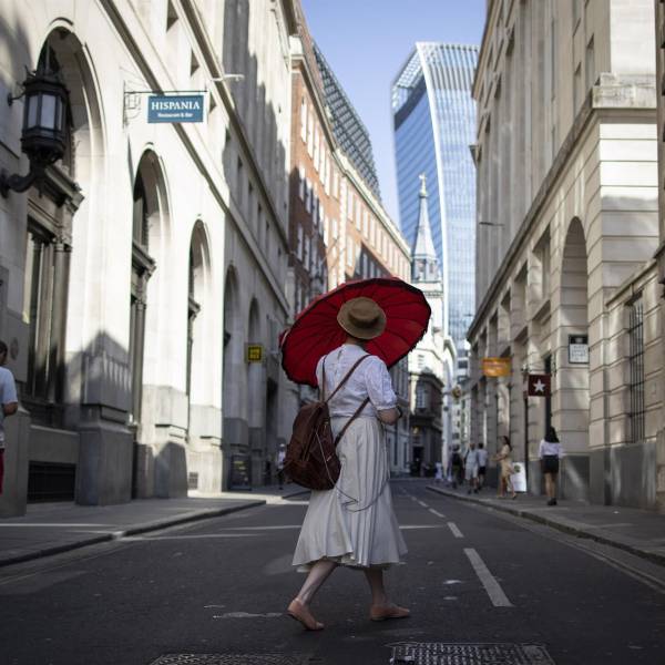 Una mujer en Reino Unido se protege del calor con una sombrilla. ( )