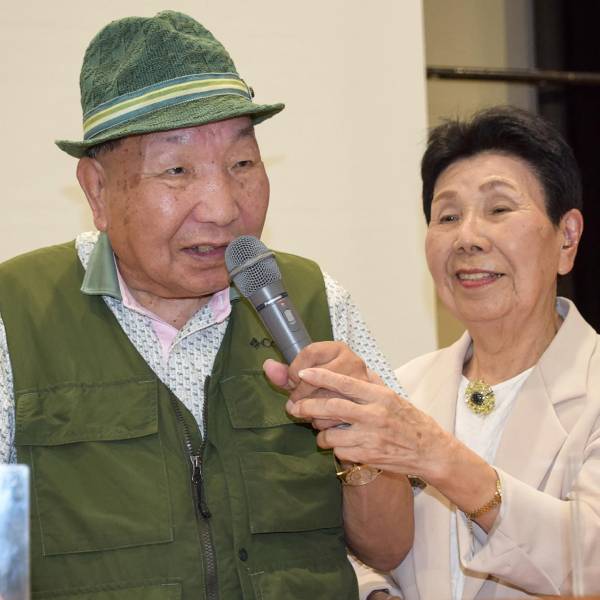 Esta foto, tomada el 29 de septiembre de 2024, muestra a Iwao Hakamada (izq.) hablando mientras su hermana Hideko (der.), de 91 años, sostiene el micrófono durante una sesión de informe de juicio.( )