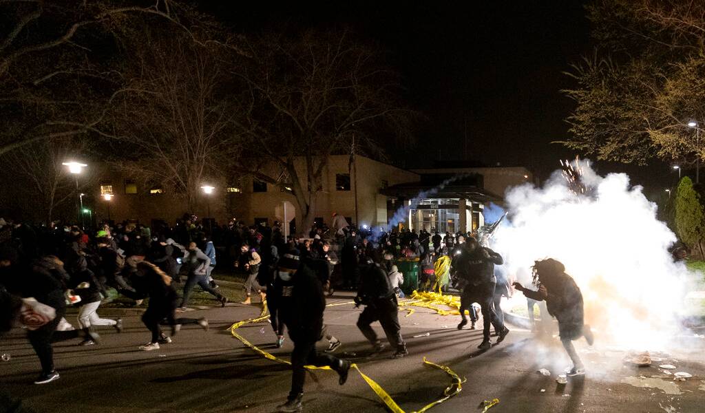Gente corriendo mientras la policía intenta dispersar a la gente ante la comisaría de Brooklyn Center. Foto: AP