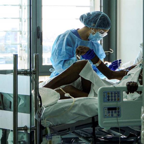 Un enfermo de Covid-19 es atendido por una fisioterapeuta en la UCI del hospital Son Espases de Palma de Mallorca. Foto: EFE.