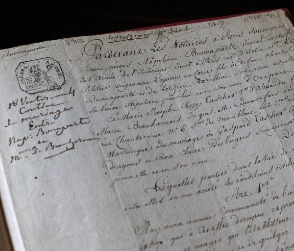 El primer artículo del contrato matrimonial, que une al futuro Napoleón I y a Marie Josèphe Rose Tascher de La Pagerie, conocida como Josefina de Beauharnais, estipula que "los futuros esposos no dispondrán de bienes gananciales". En consecuencia, "los futuros esposos no tendrán ninguna obligación respecto a las deudas e hipotecas del otro".