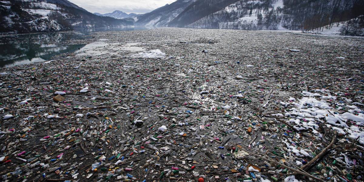 ARCHIVO - En esta fotografía del viernes 22 de enero de 2021, botellas de plástico y otros desechos flotan en el lago Potpecko, en Serbia. (AP Foto/Darko Vojinovic/Archivo)( )