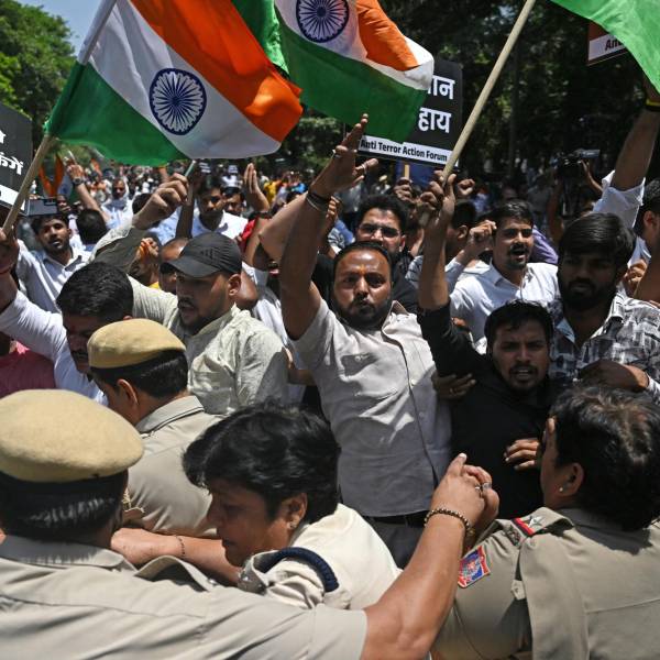 Manifestantes se enfrentan con personal de seguridad durante una marcha de protesta hacia la Alta Comisión de Pakistán, condenando el ataque a turistas en Pahalgam, en Nueva Delhi, el 24 de abril de 2025.( )