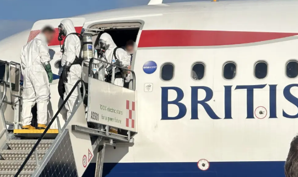 El avión, que iba de Londres a Egipto, se desvió a Venecia; equipos con traje de protección recibieron a los viajeros en tierra.