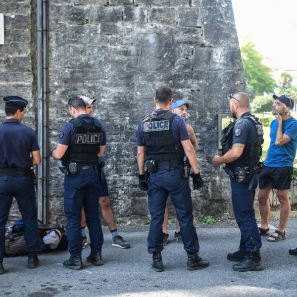 Policía revisa a ciudadanos debido a que esperan protestas en la cumbre del G7. Foto: AFP