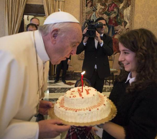 El papa Francisco sopla las velas de su tarta de cumpleaños