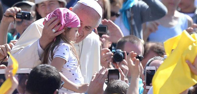 CIUDAD DEL VATICANO.- El papa Francisco besa a una niña al incio de su audiencia general de los miércoles, en la Plaza de San Pedro. Foto: EFE