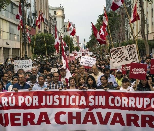 La mayor movilización contra el fiscal general Pedro Gonzalo Chávarry se realizó en Lima, donde centenares se manifestaron pacíficamente bajo resguardo policial. Chávarry destituyó el 31 de diciembre a los fiscales José Domingo Pérez y que investigan el caso Lava Jato en Perú, pero los repuso el miércoles ante la ola de críticas y manifestaciones que pedían su renuncia, entre acusaciones de encubrimiento a dirigentes políticos investigados por el caso Odebrecht.