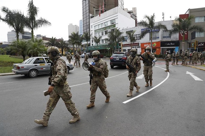 Las fuerzas armadas y la policía se ocupan de controlar el cumplimiento del estado de emergencia en ciudades como Lima, que luce fantasmal con sus negocios cerrados y sus calles desiertas.