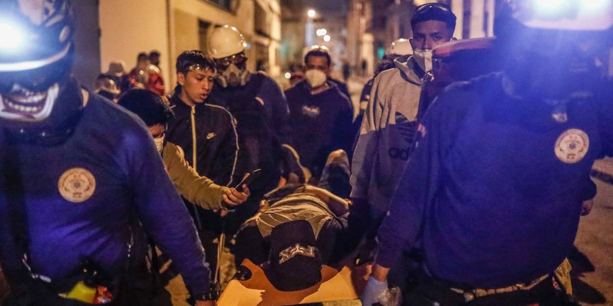 Un manifestante herido en enfrentamientos con la Policía recibe ayuda en el centro de Lima (Perú). ( )