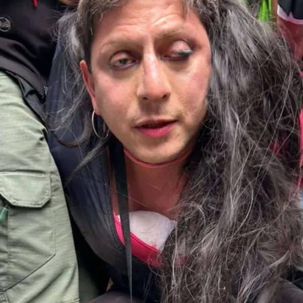 Hombre disfrazado de mujer, tiene peluca y pestañas postizas.( )