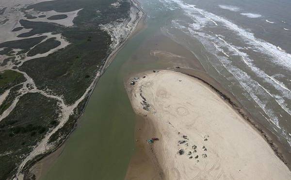 Sus aguas dulces se unen, mezclan y revuelven con las saladas del golfo. En medio de dos tramos de arena sucia fluye un espejo de agua marrón que en su punto más flaco no mide 30 metros. A quienes llegan sin conocer les invade la duda, genuina, de saber exactamente dónde se acaba Estados Unidos y si lo que se ve del otro lado es México.