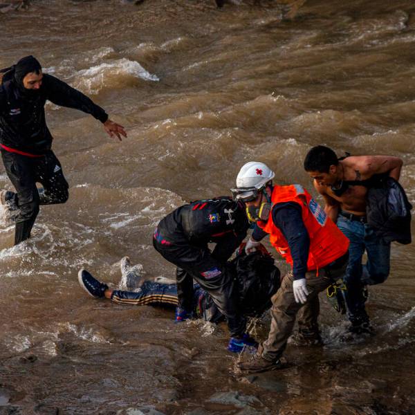 Paramédicos y manifestantes atienden a un adolescente que cayó al Río Mapocho. Foto: AP.