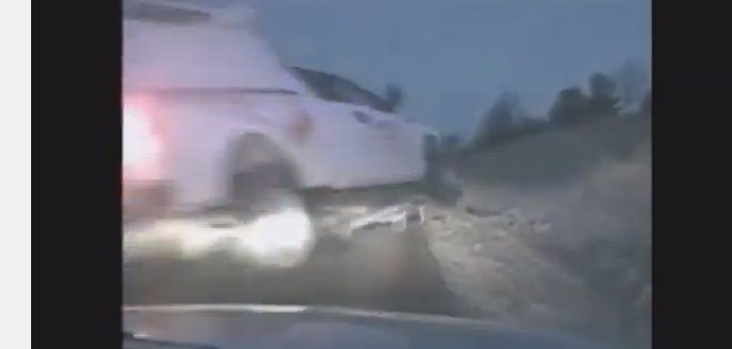 De repente aparece una furgoneta volando por los aires, la que prácticamente roza al policía. El carro cae pesadamente en el pavimento causando heridas leves a sus ocupantes.