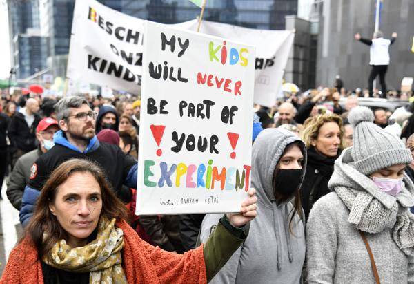Los manifestantes marcharon hacia la sede de la Unión Europea, gritando “¡Libertad! ¡Libertad!” y con pancartas que decían “Unidos por nuestra libertad, nuestros derechos y nuestros hijos”. Algunos también sostenían carteles con lemas contra las vacunas.