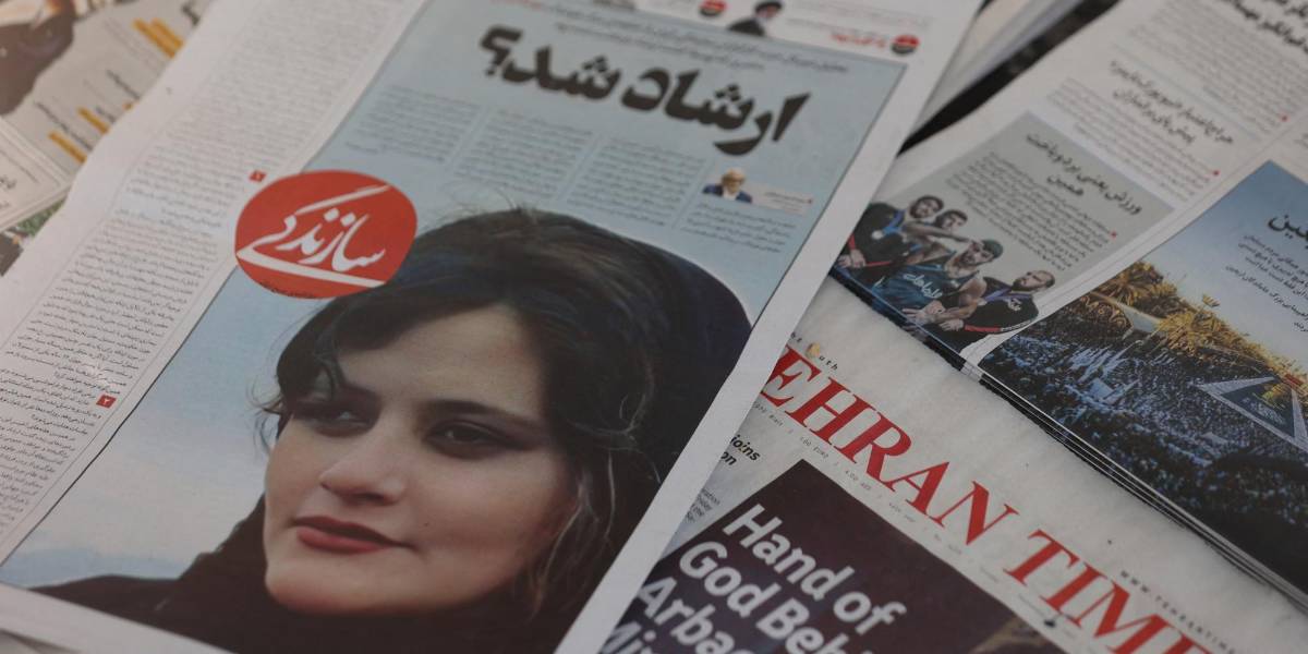 Periódicos con la imagen Amini, víctima de la "policía de la moralidad" del país, se ven en Teherán.( )