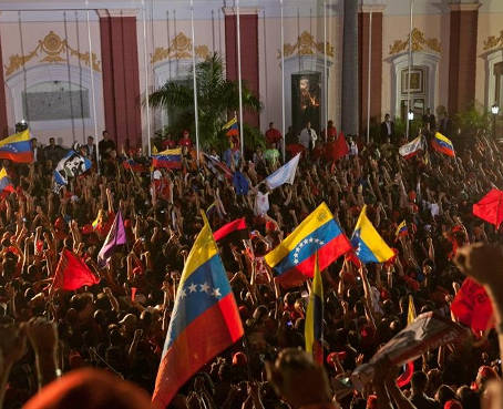 Ya se ha hecho costumbre que, tras unas elecciones, los seguidores de Chávez se concentren frente a Miraflores para escuchar el himno nacional cantado por el presidente y después sus palabras de triunfo. Por ello, los vendedores ambulantes de chucherías, cervezas y cigarros ya estaban allí cuando llegaron las masas.