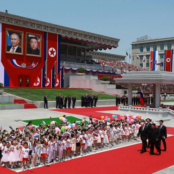 La plaza Kim Il Sung de Pyongyang estaba repleta de multitudes, globos de colores, flores, coreografías para la llegada del mandatario ruso.