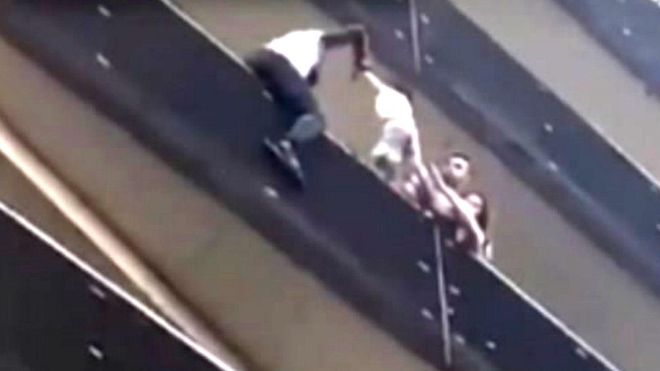Imagen del video cuando Mamoudou Gassama llega al cuarto piso sujeta el niño.