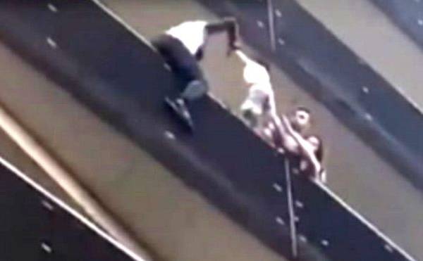 Todos miraban a un niño pequeño que colgaba del borde de un balcón del cuarto piso, de una sola mano, mientras que un vecino, al otro lado de la pared divisoria, trataba desesperadamente de alcanzarlo.