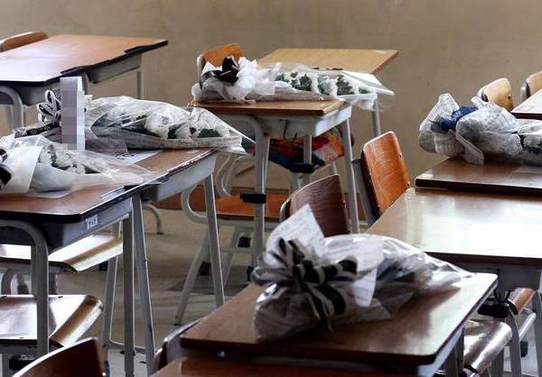 COREA DEL SUR.- El colegio colocó ramos de flores sobre los pupitres de los estudiantes fallecidos en el naufragio del ferry. Fotos: Agencias