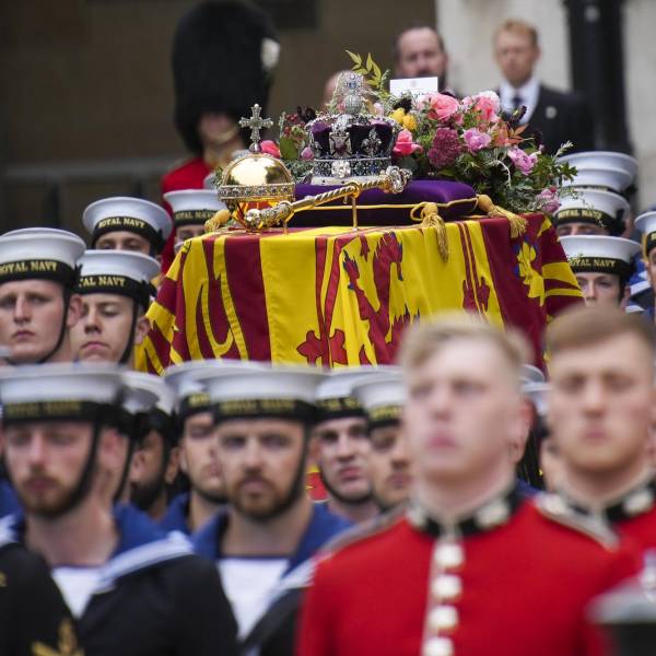 El rey Carlos III y sus tres hermanos, la princesa Ana y los príncipes Andrés y Eduardo, así como los príncipes Guillermo y Enrique, nietos de Isabel II, caminaron junto al féretro. Los príncipes Jorge y Carlota desfilaron asimismo al lado de sus padres, los príncipes de Gales.