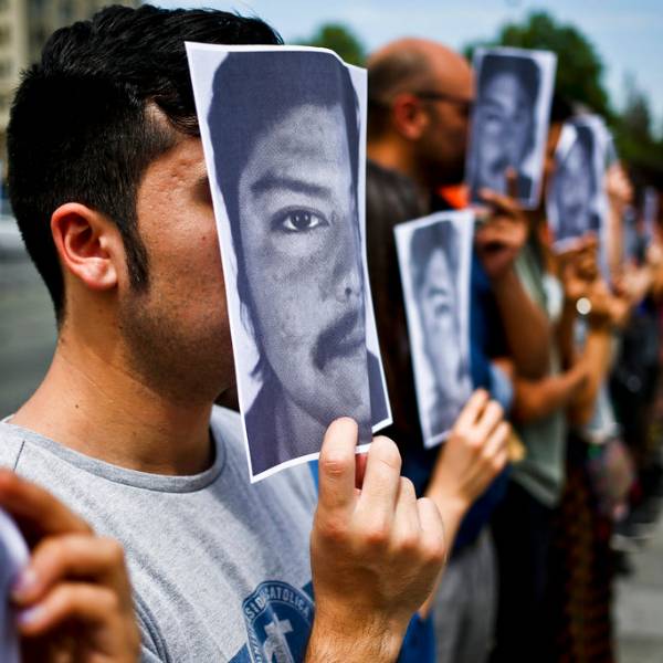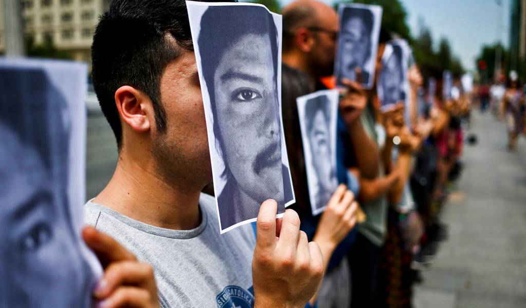 Estudiantes de la Universidad de Chile sostienen papeles con la imagen del mapuche Camilo Catrillanca. Foto: AP