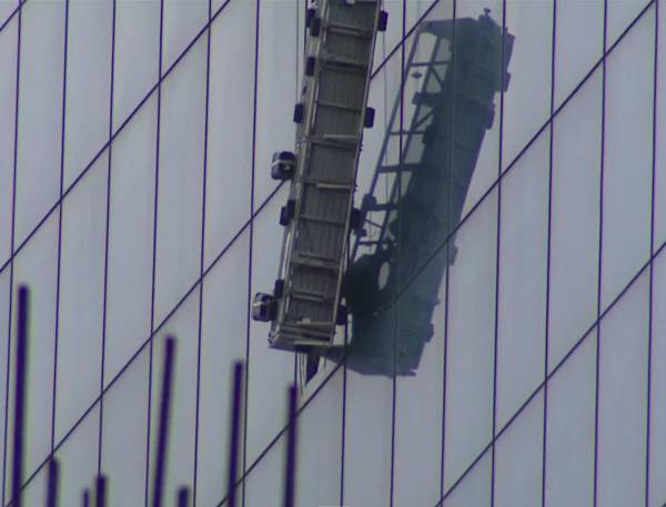 Los rescatistas cortaron una ventana para llegar hasta los dos trabajadores que lavaban los vidrios del edificio, luego de que quedaran suspendidos a 240 m de altura cuando uno de los cables de su andamio se soltó.
