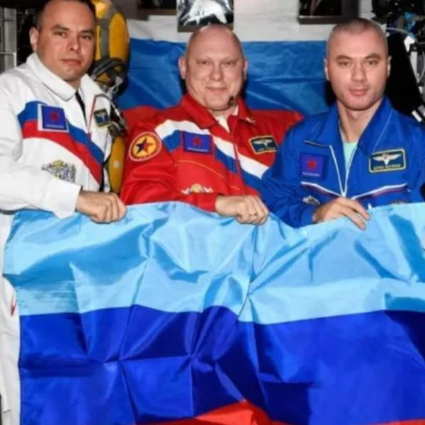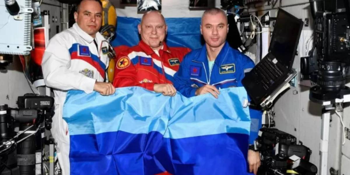 Cosmonautas rusos en el espacio muestran una bandera que apoya la guerra en Ucrania.( )