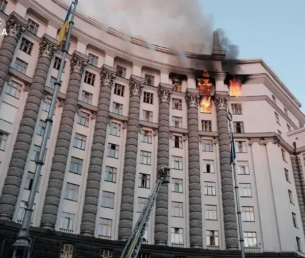 Envuelto en llamas. Así amaneció este domingo el principal edificio del Gobierno de Ucrania en Kyiv, tras ser alcanzado por fuego ruso por primera vez desde el inicio de la guerra en 2022. El simbólico ataque se produjo en medio de una nueva ola de bombardeos masivos por parte del Kremlin, confirmó la primera ministra ucraniana.