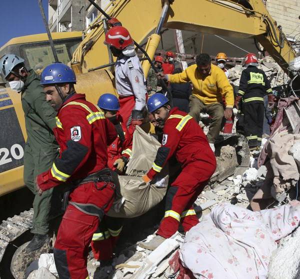 Un equipo de rescate retira de los escombros el cuerpo de una víctima del terremoto en Sarpol-e-Zahab, en el oeste de Irán. Foto: AP