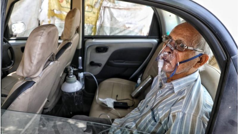 Sushil Kumar Srivastava fue fotografiado sentado en su automóvil, conectado a un cilindro de oxígeno mientras su desesperada familia lo llevaba de un hospital a otro.