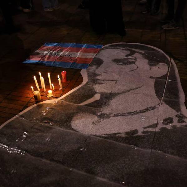 Se colocan velas cerca de un mural de Sara Millerey, mujer trans torturada y asesinada, durante una protesta contra su transfemicidio en Bogotá, Colombia, el 9 de abril de 2025.( )