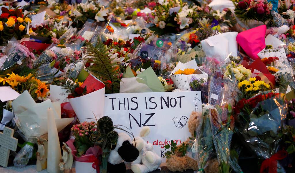 Numerosos ramos de flores son depositados el 16 de marzo de 2019 en un altar improvisado cerca de la mezquita Masjid Al Noor. AP